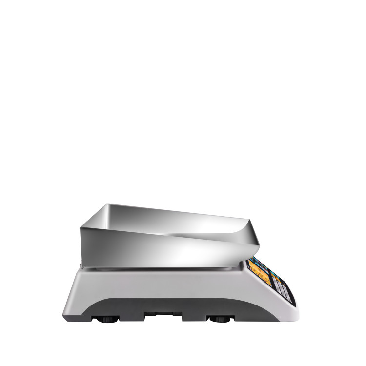 در این مدل نیز خبری از علمک نیست. نمایشگر رنگی و صنعتی LCD به صورت دوطرفه روی بدنه تعبیه شده است تا هم کاربر و هم مشتری، اطلاعات توزین را به روشنی ببینند. این نمایشگر، ظرفیت نمایش ۹ رقم قیمت کل و ۸ رقم قیمت واحد را دارد. در محیطهای کاری شلوغ، نبود علمک نهتنها دید را مختل نمیکند، بلکه ترازویی جمعوجور و کاربردی در اختیار کاربر میگذارد که برای پیشخوانهای کوچک نیز ایدئال است.