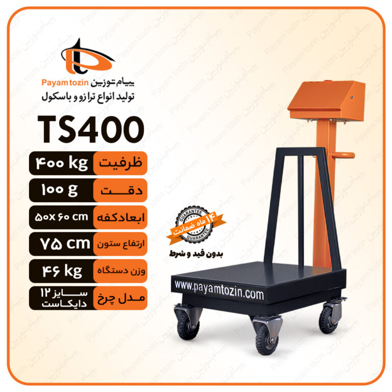 باسکول 400 کیلویی پیام توزین مدل TS400 یکی دیگر از تولیدات شرکت پیام توزین در دسته باسکول صنعتی می باشد. قدرت توزین این باسکول حداکثر 400 کیلوگرم و حساسیت آن 100 گرم بوده که این میزان حساسیت قابل تنظیم نیز می باشد. تمام بدنه باسکول 400 کیلوگرم پیام توزین از فلز بسیار محکم ساخته شده بنابراین در مورد استحکام و مقاومت بالای این باسکول صنعتی چرخدار پیام توزین جای هیچ گونه تردیدی باقی نخواهد ماند.